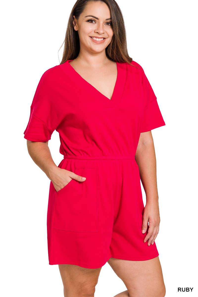 SI-22085 Plus Drop Shoulder V Neck Romper With Pockets