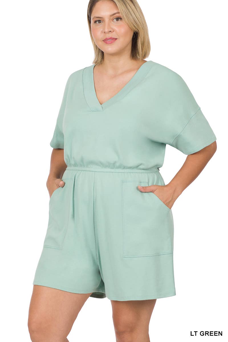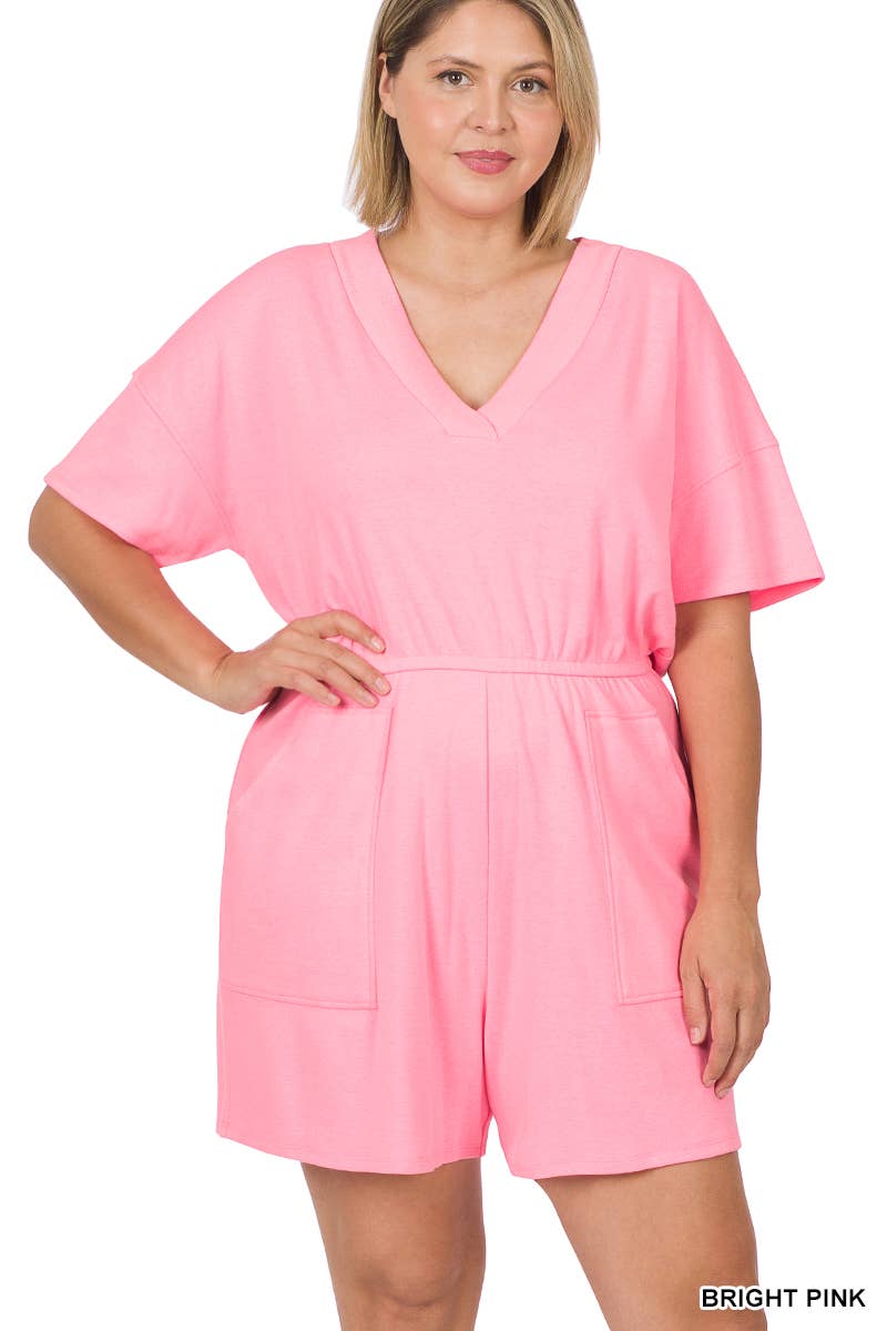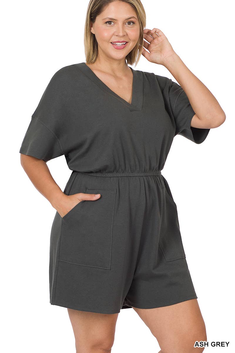 ..._ SI-22085 Plus Drop Shoulder V Neck Romper With Pockets