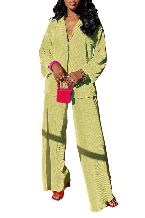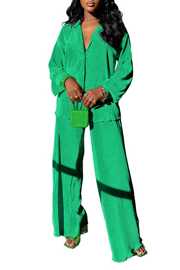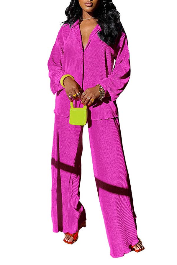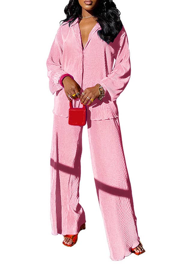 Embrace style and comfort with our MB Fashion Blouse Top and Pants Set. This pleated 2 piece outfit features a loose button shirt blouse top and long wide leg pants. Perfect for a casual summer look, this set offers both style and ease for any occasion!