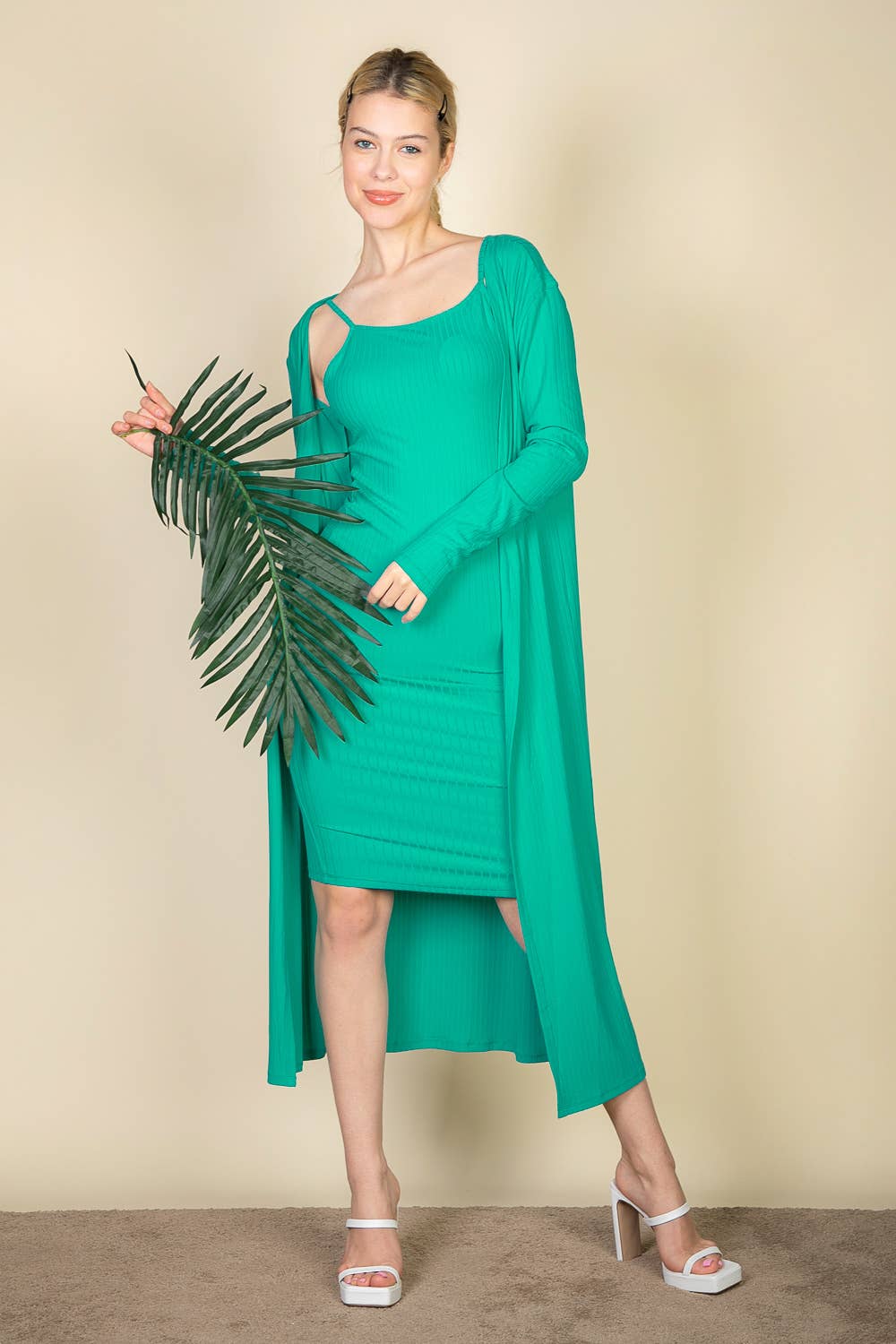 ribbed bodycon dress, cardigan and dress set, midi cami dress, chic two-piece outfit, longline cardigan, trendy ribbed knit, casual and dressy ensemble