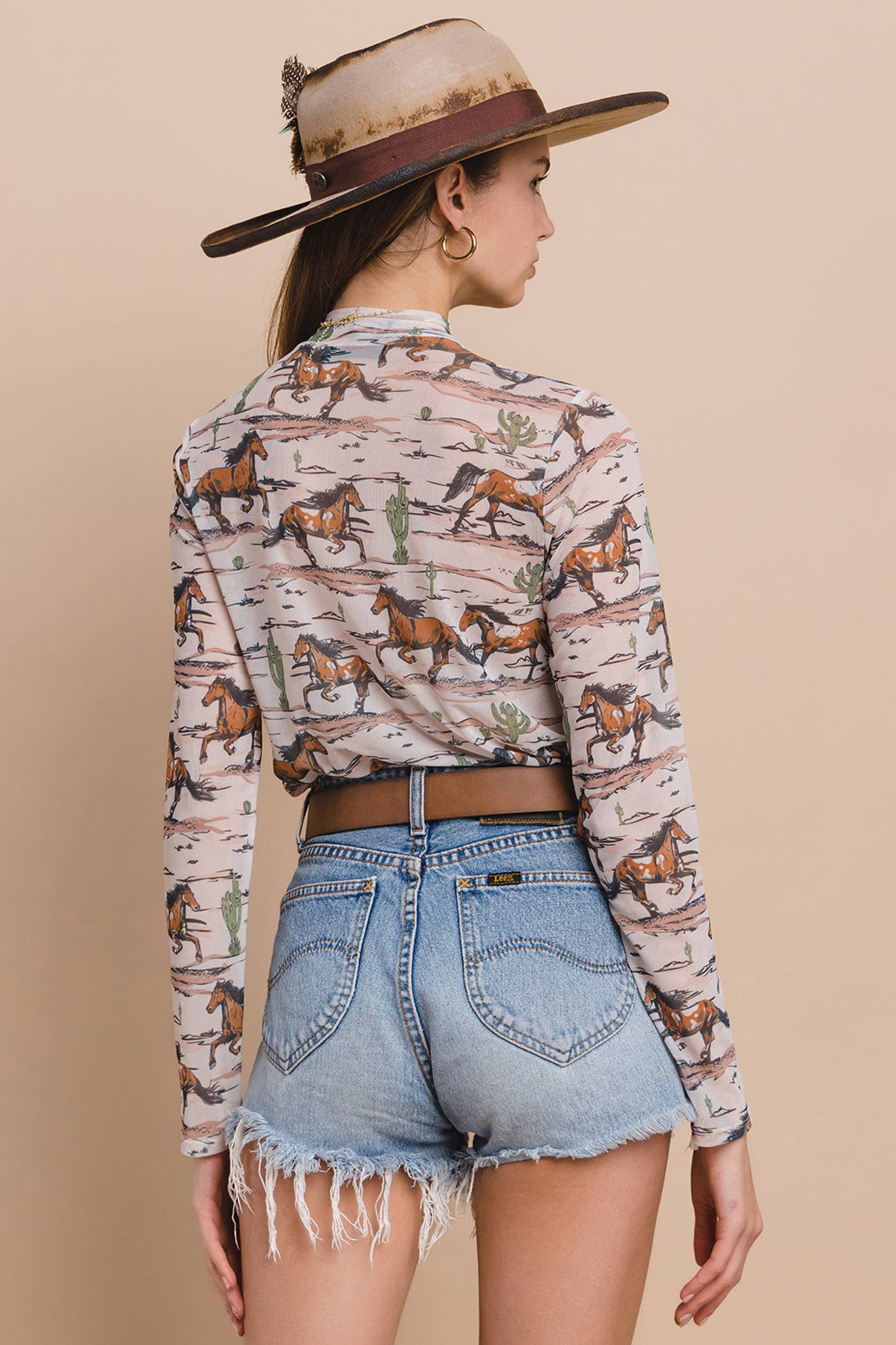 - Western Horse Stables Print On Mesh Fabric - Mock Neck - Fall, Inner Top - Long Sleeves - Casual, Party Friendly Inner Top - Made in USA - Model: 5'10" 32-24-37